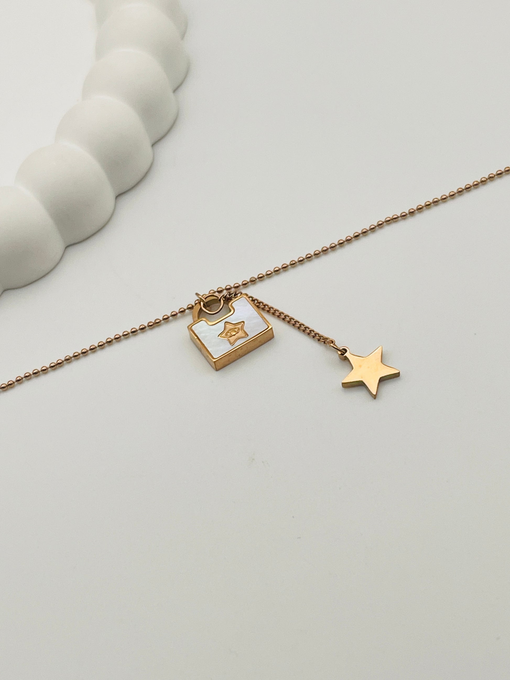 • Design: Single Chain with central square lock charm and hanging star charm