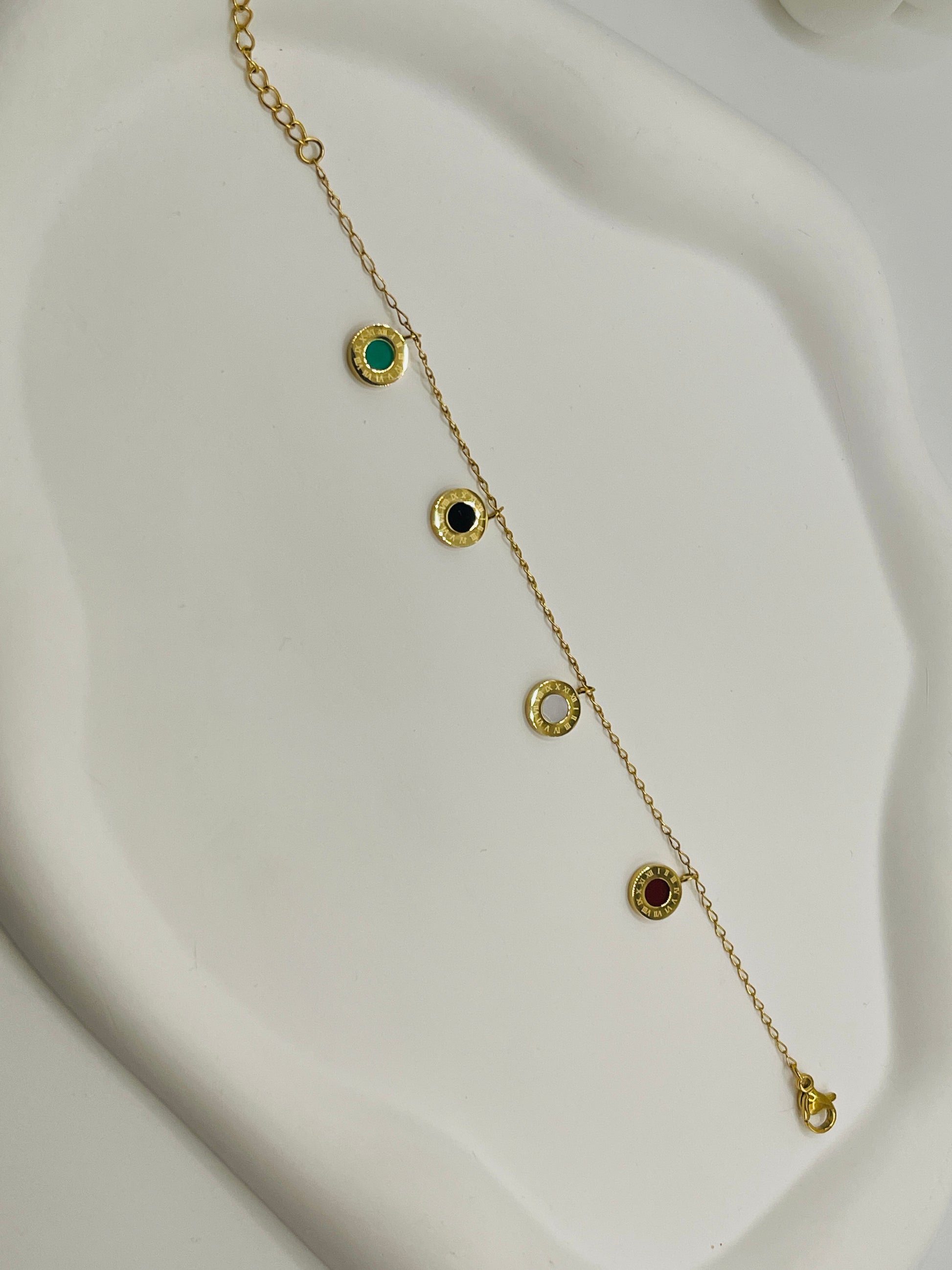 - Design: Delicate link chain bracelet with a fun arrangement of alternating multi-colored coin charms.