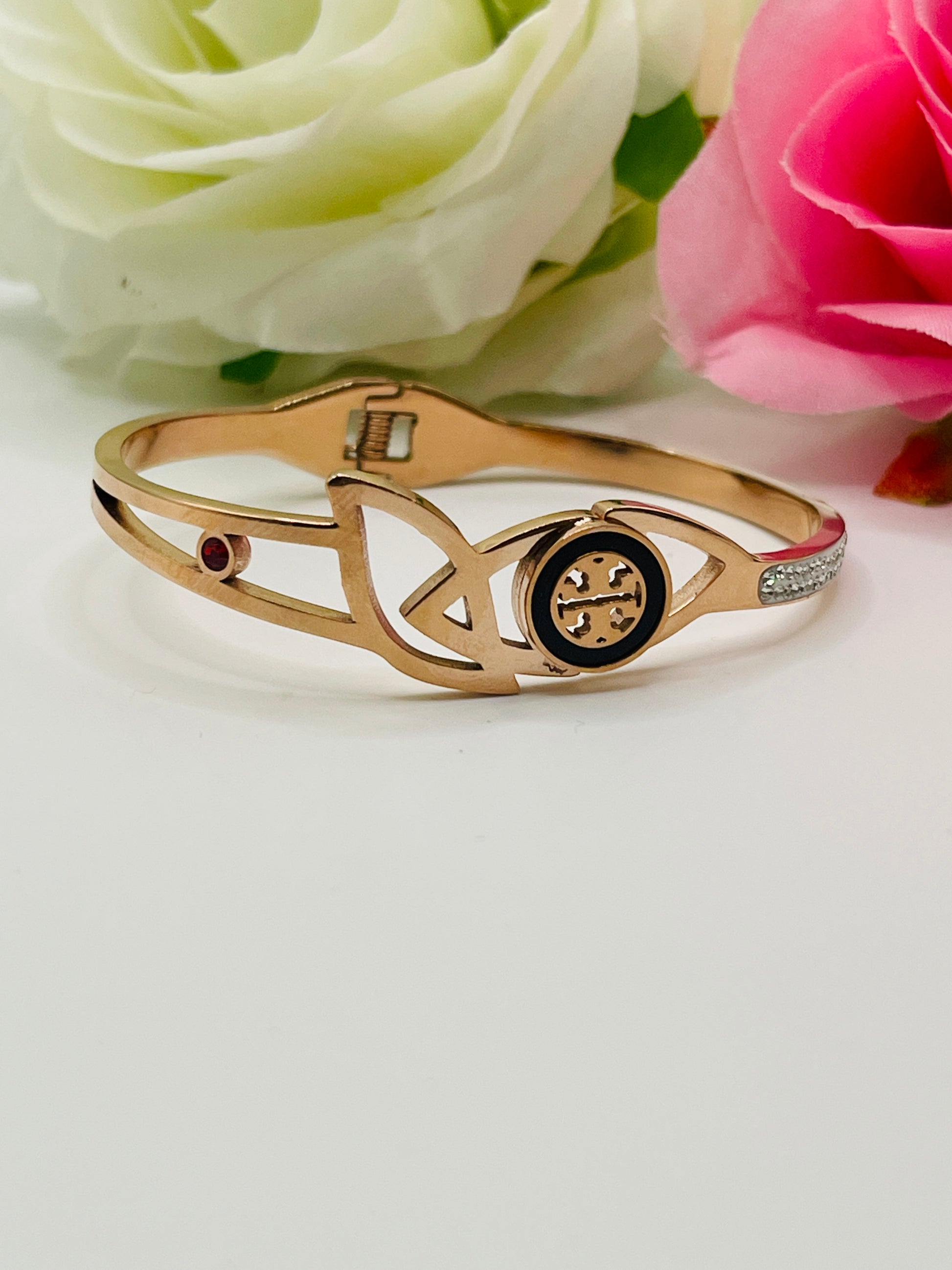 - Design: Structured hinged bracelet with sweeping, curved openwork elements.