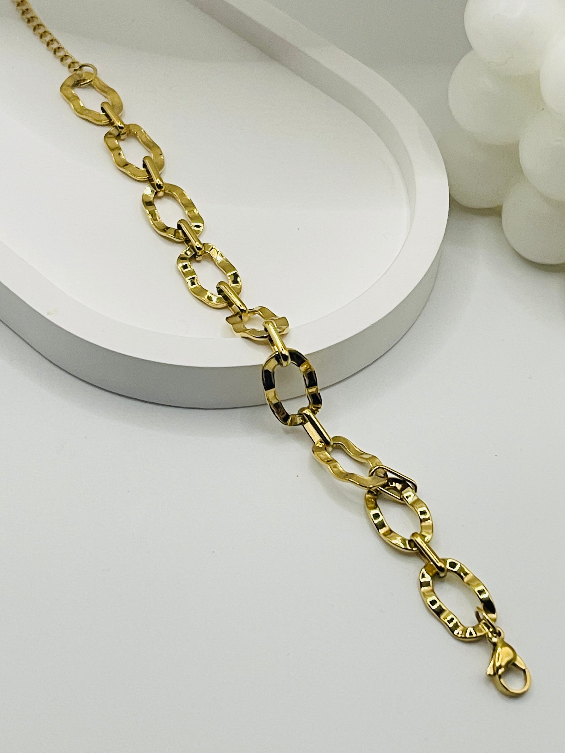 - Contemporary Design: Features large, irregular oval links with a modern, hammered/textured finish.