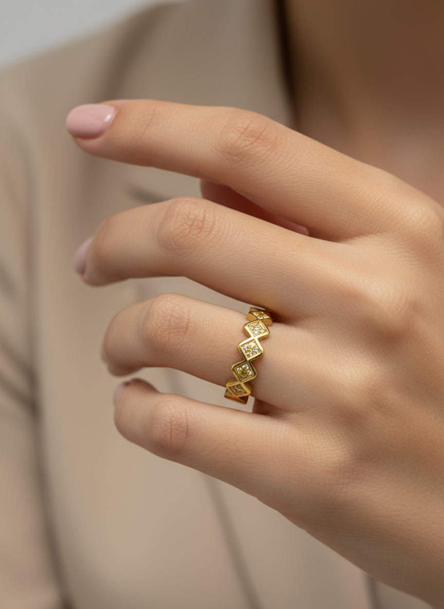 - Key Feature: The squared stones are set flush with the band's edge for a comfortable, low-profile fit.
