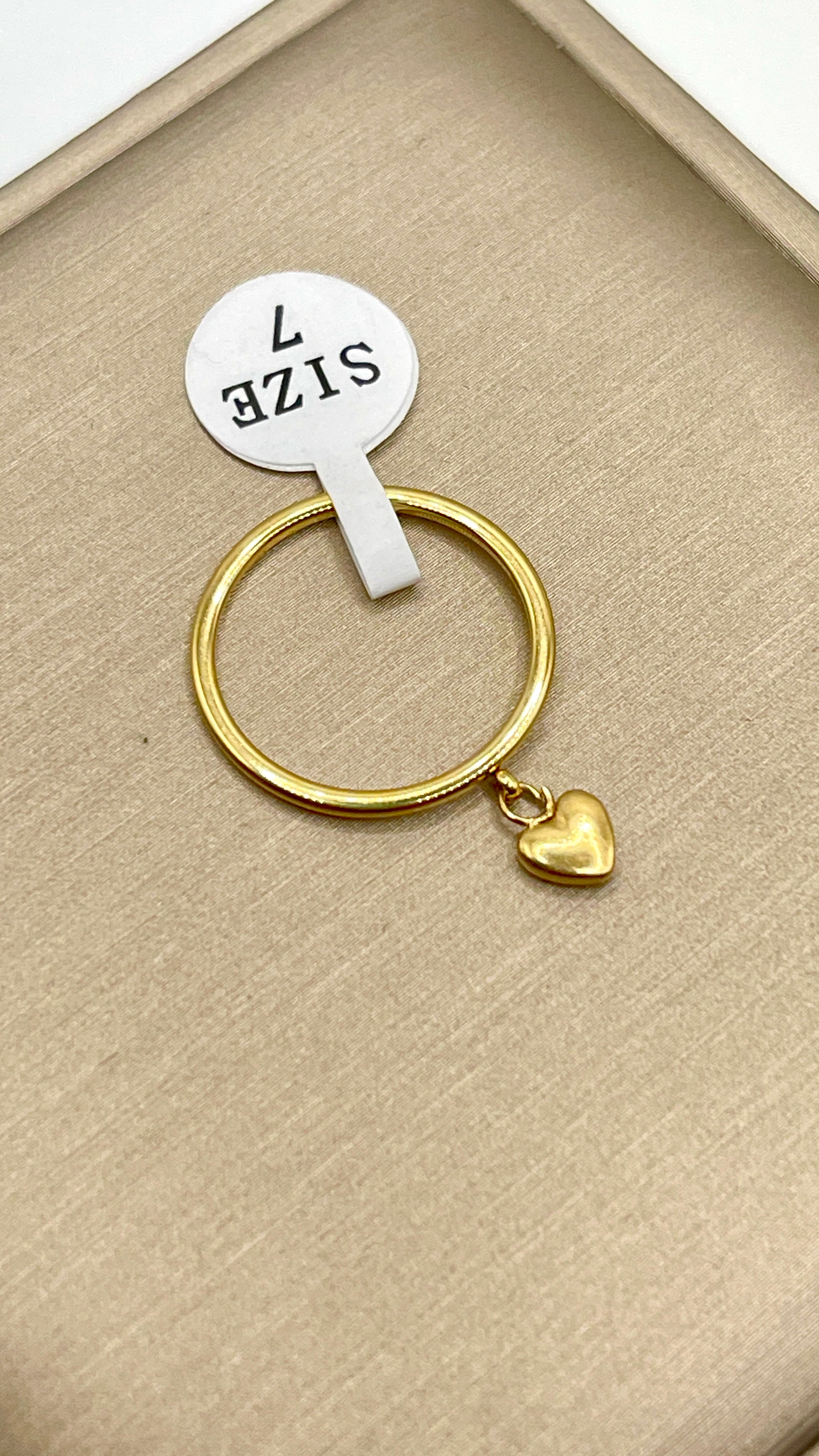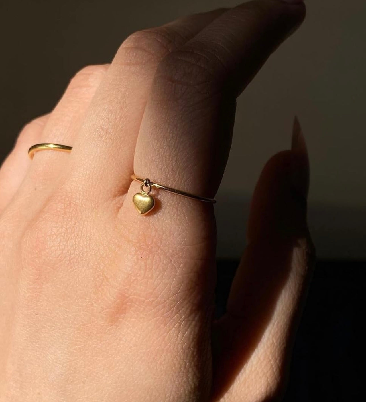 Design: An exceptionally delicate and thin band adorned with a tiny, polished dangling heart charm.