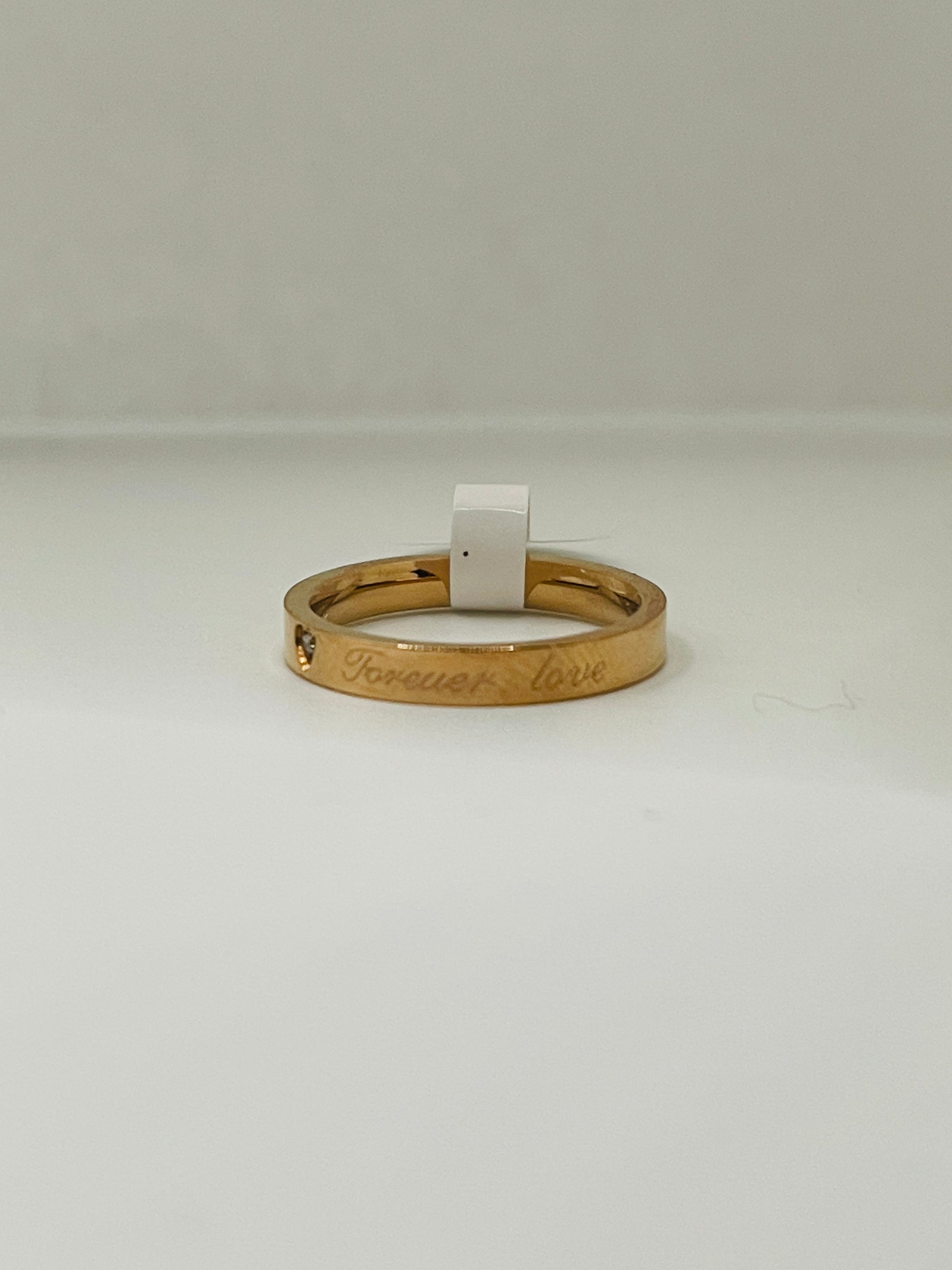 Design: Flat band with "Forever" script engraving and a single flush-set stone