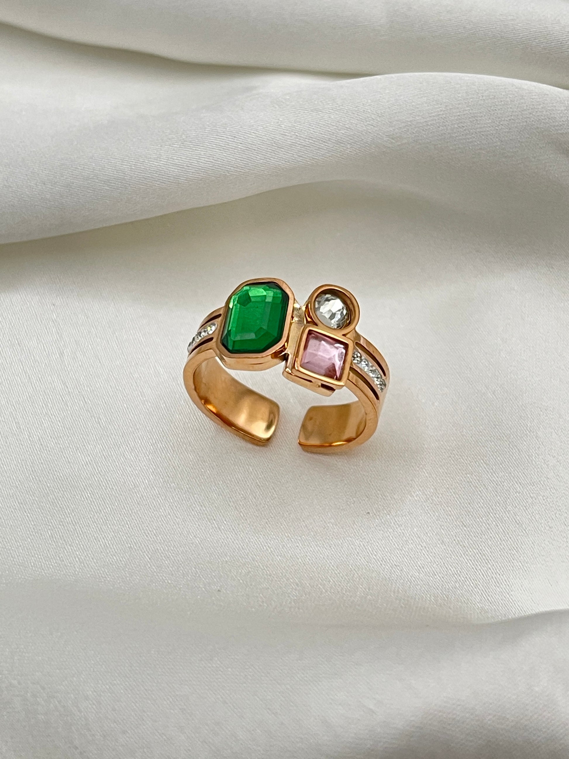 - Design Feature: Features a unique arrangement of three geometric-cut colorful stones (Emerald Green, Blush Pink, and Clear/White) accented with delicate pave crystals.