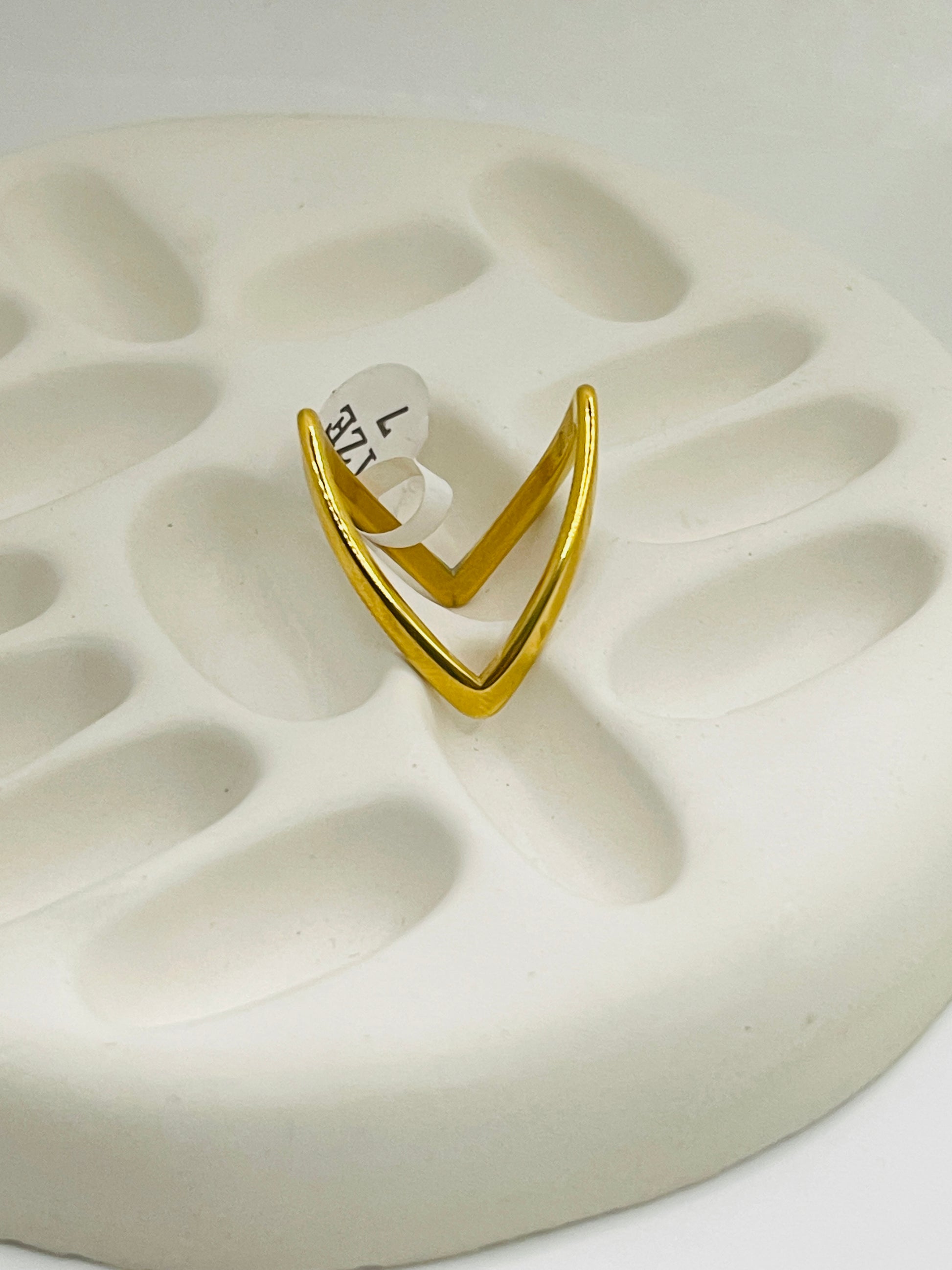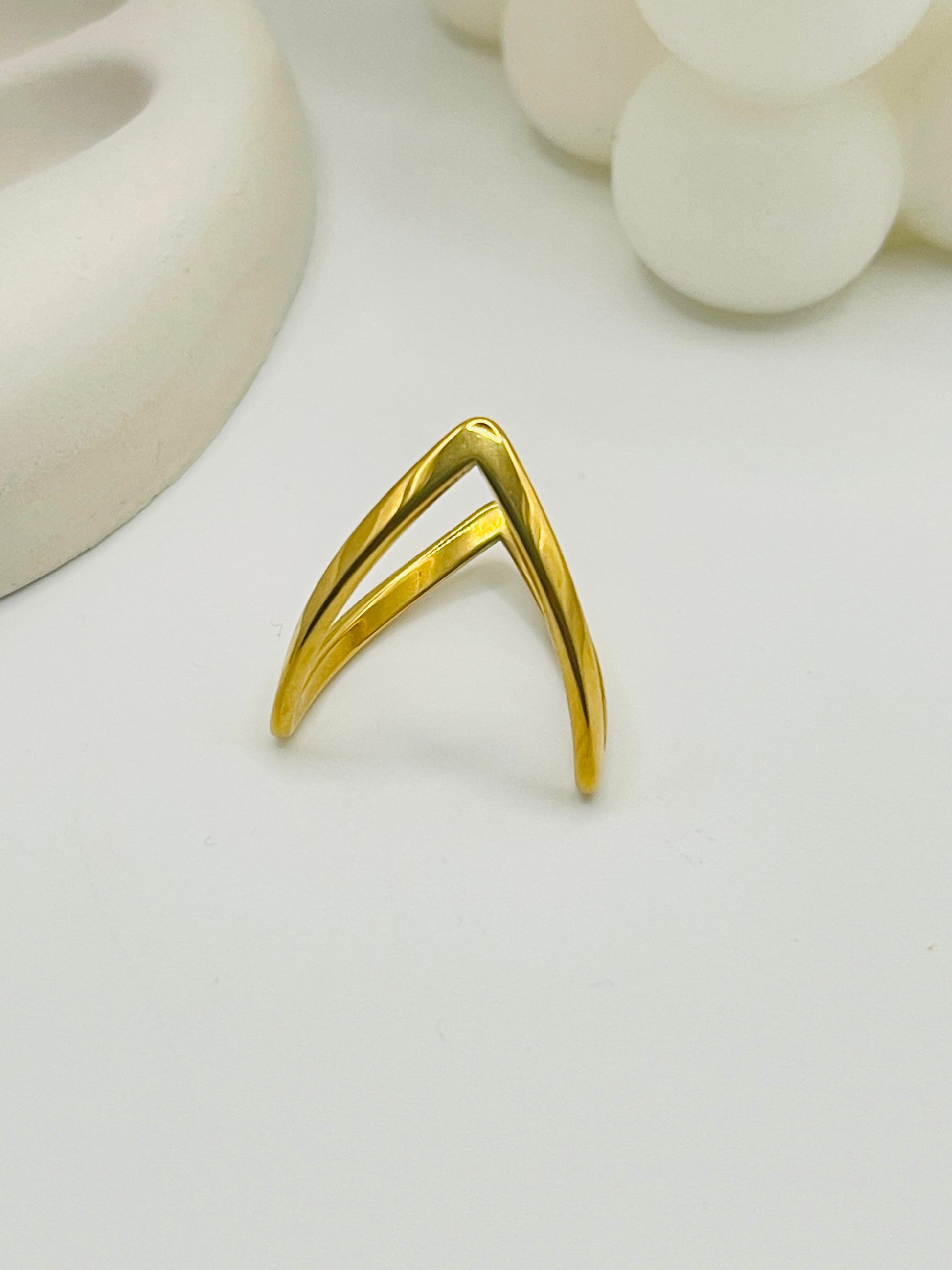 This ring features a striking double-V design that creates the trendy "stacked" look in a single piece, making it a powerful statement on its own or a perfect complement to other rings.